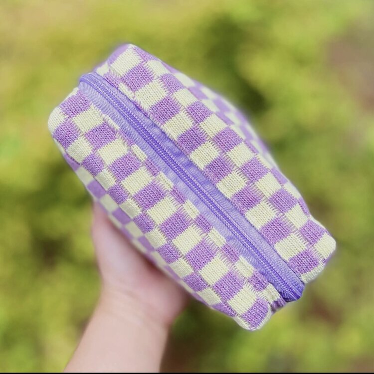 This handy cosmetic bag is in checkered pattern knitted material. Light Vinyl lining inside. Absolutely adorable!Dimension: 11” x 4.5” x 3”