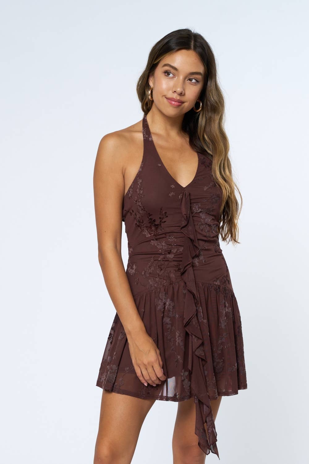 Edgy and glamorous, this halter mini dress features a burnout velvet body with sheer mesh panels for a bold, statement-making silhouette. Perfect for parties, night-outs, or any occasion where you want to stand out.