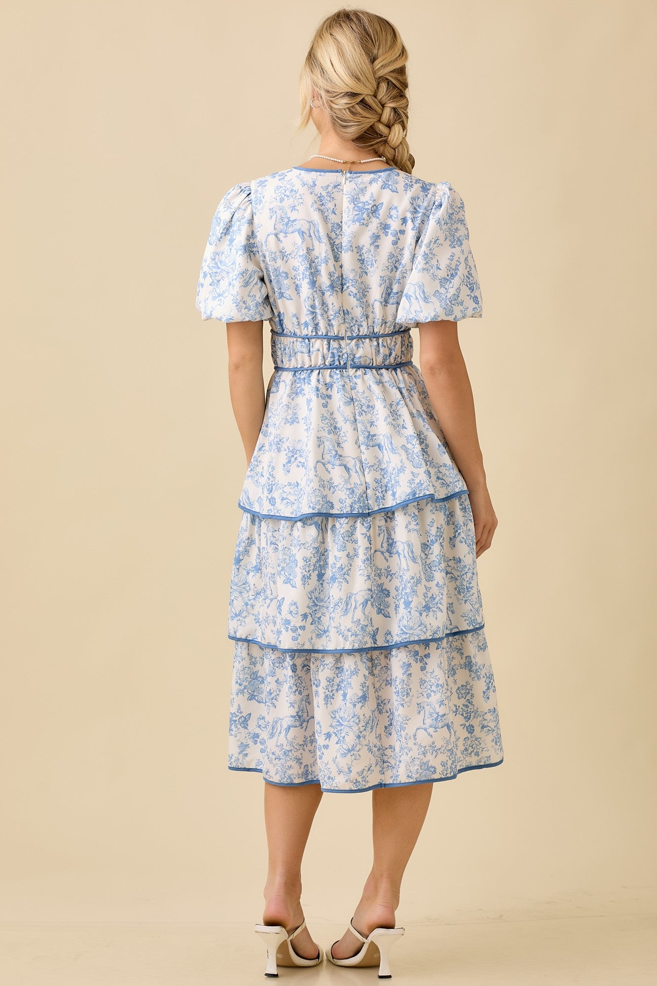 Elevate your wardrobe with this Vintage Blue Midi Dress featuring a charming vintage horse toile print. The tiered silhouette and ruffle details create a flattering, feminine shape, while the contrast binding adds a subtle yet stylish touch. Perfect for daytime events or casual outings, this dress combines classic elegance with playful design for a standout look.