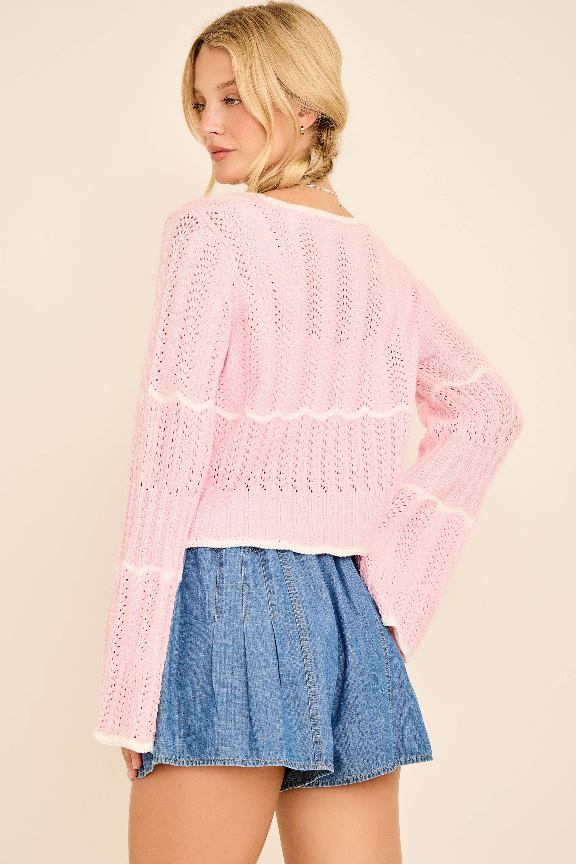 Wrap yourself in cozy elegance with this charming pointelle cardigan. Crafted from soft, breathable acrylic, it features delicate textured details that add visual interest and dimension. The long sleeves provide gentle coverage, while the tie closure offers adjustable comfort and a flattering silhouette. Perfect for layering over your favorite pieces, this bubblegum pink knit brings a touch of sweetness to any outfit—whether you're dressing up or keeping it casual.