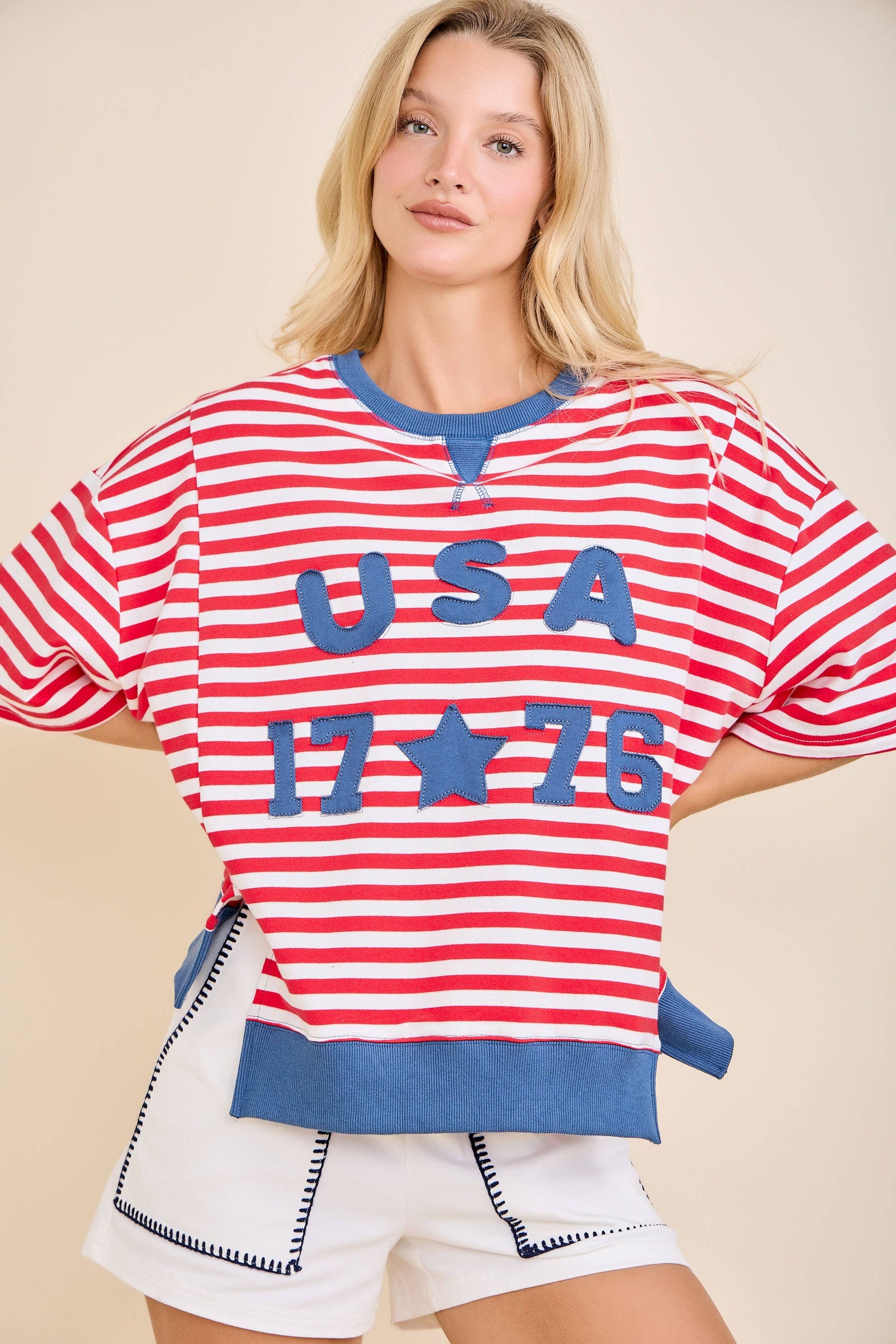 Show your American pride in this chic striped top featuring bold “USA” rope embroidery. Designed in a relaxed fit with soft knit fabric and ribbed neckline for all-day comfort.