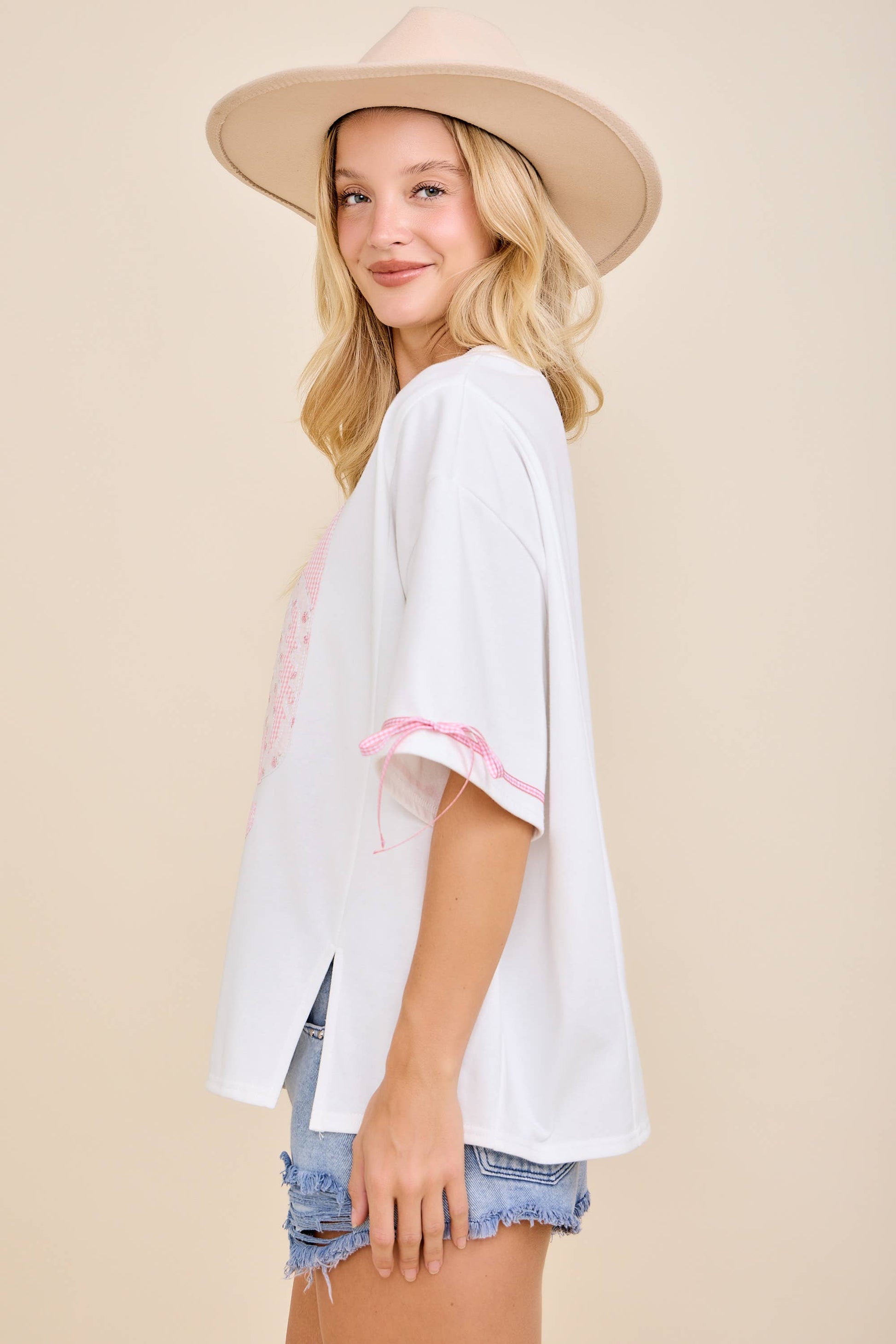 Embrace your inner cowgirl with the Western Boots Patch Tee, where sweet meets western in the most charming way. This playful top features a pink gingham boots patch paired with delicate floral embroidery and ribbon sleeve ties, all set in a relaxed oversized fit that's perfect for laid-back days or nights out dancing. Whether you're heading to a line dance, running errands, or just channeling that effortless country-girl energy, this tee brings authentic western flair to your wardrobe. Style it with your favorite denim or a tiered mini skirt for that coveted "Cowgirl Chic" aesthetic that celebrates your unique personality.